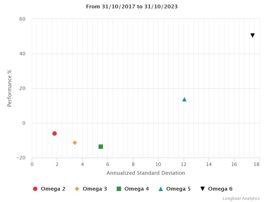| Omega 5 | 13.71% | 2.16% | 12.0683 | -30.7982% | 1.0486 |