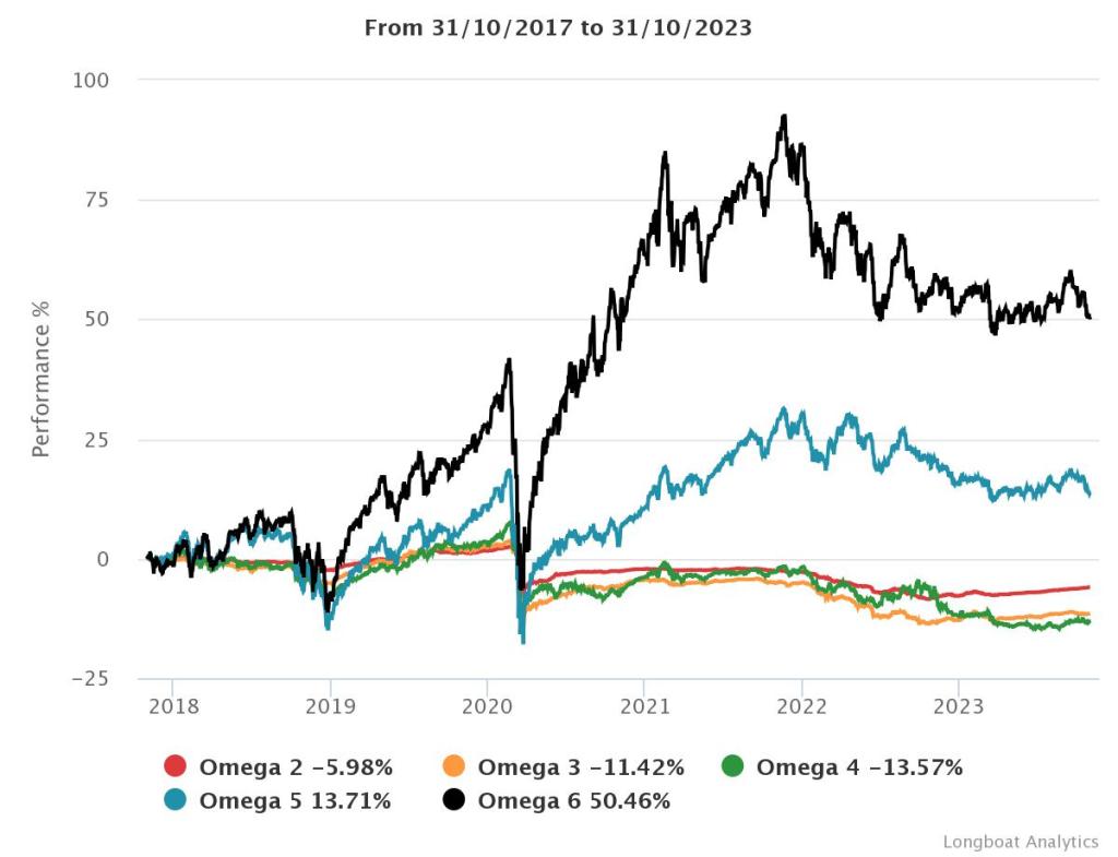 | Omega 6 | 50.46% | 7.05% | 17.4558 | -34.1986% | 1.0922 |