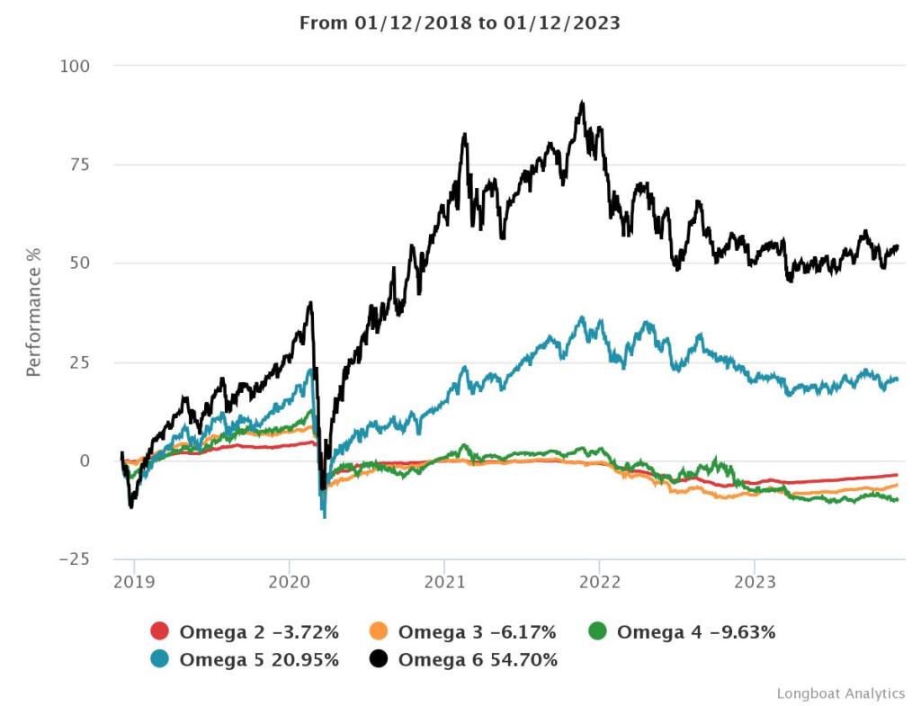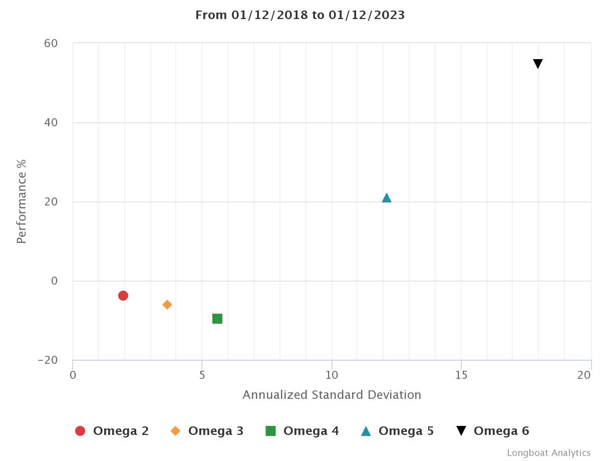 | Omega 5 | 20.95% | 3.88% | 12.1082 | -30.7982% | 1.0799 |