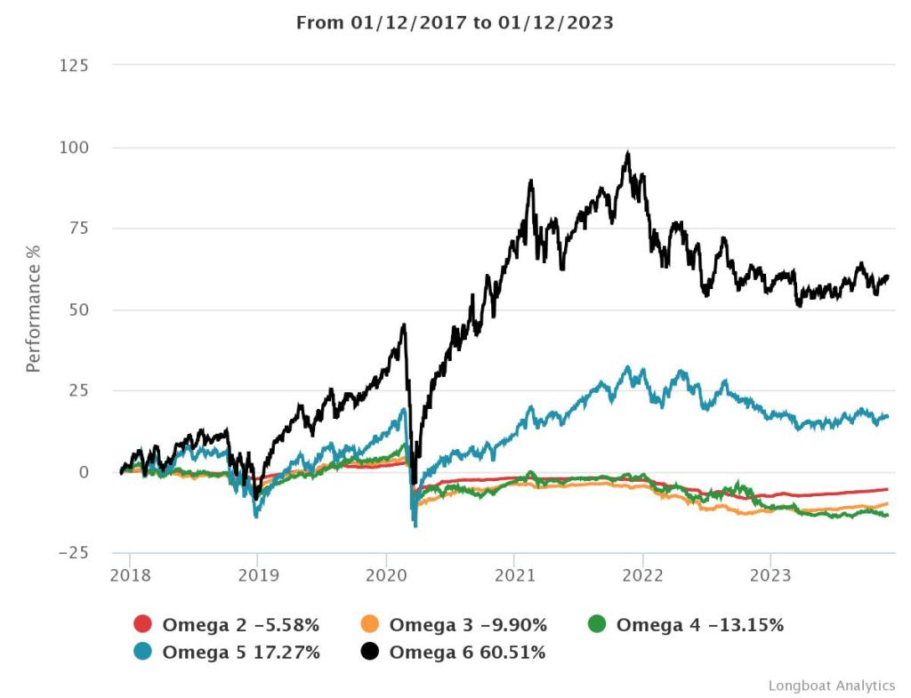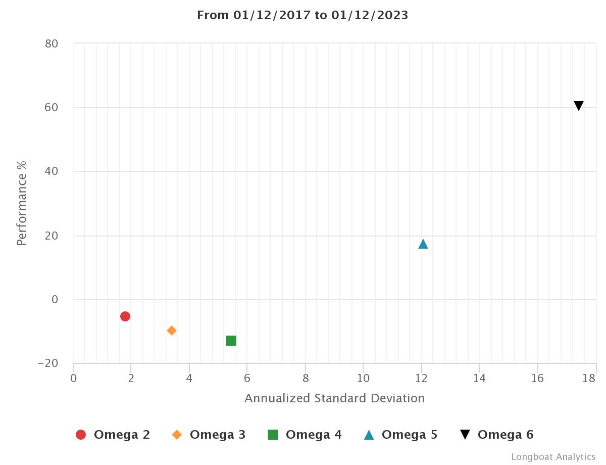 | Omega 5 | 17.27% | 2.69% | 12.0490 | -30.7982% | 1.0578 |