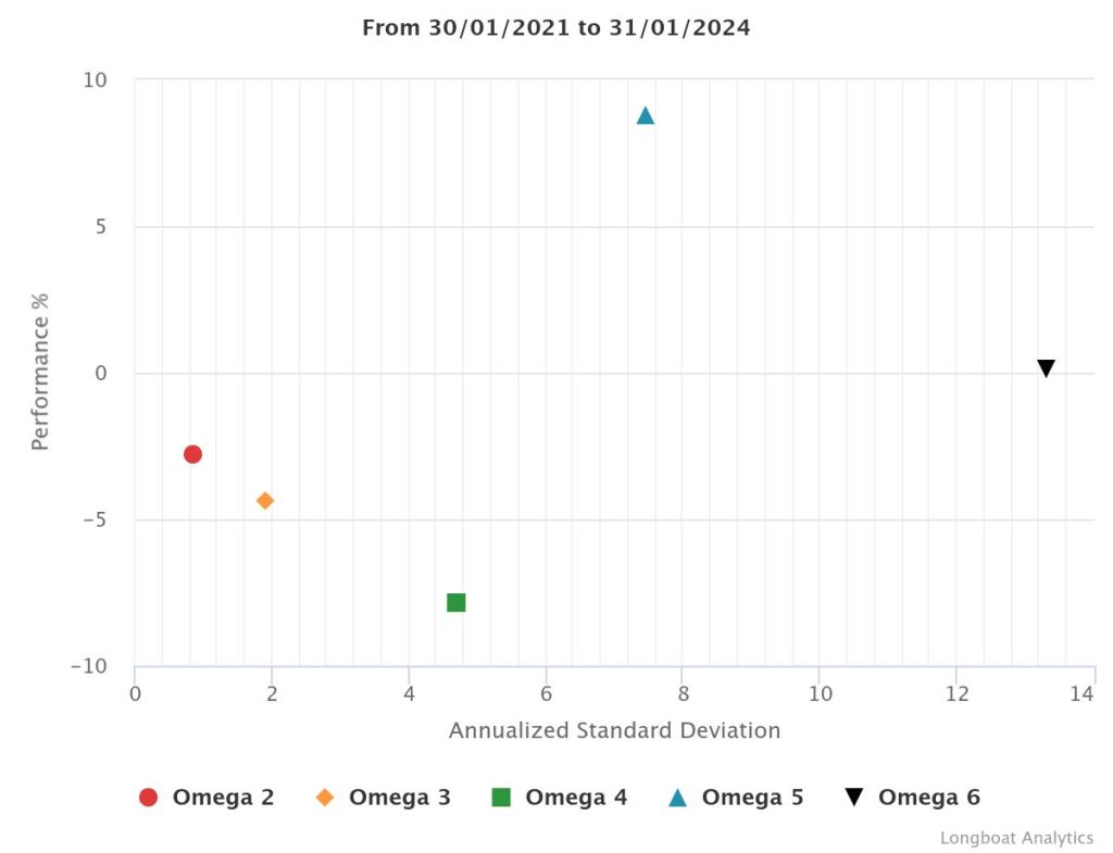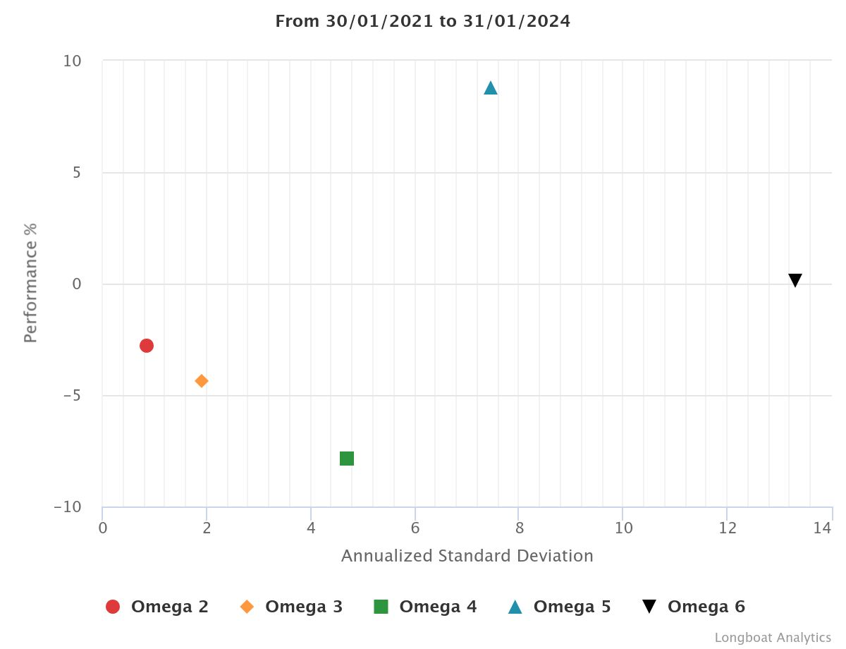 | Omega 5 | 8.78% | 2.84% | 7.4699 | -14.7126% | 1.0709 |