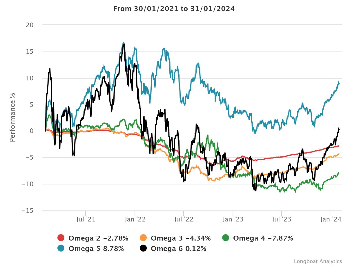 | Omega 3 | -4.34% | -1.47% | 1.9135 | -9.8868% | 0.8608 |