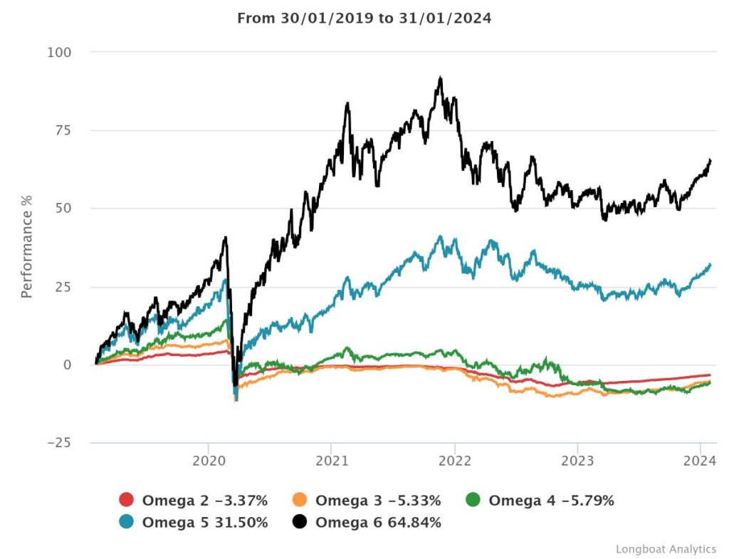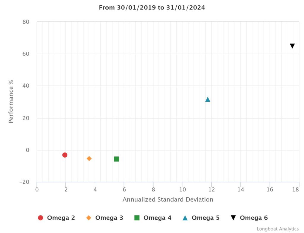 | Omega 5 | 31.50% | 5.63% | 11.7534 | -30.7982% | 1.1156 |