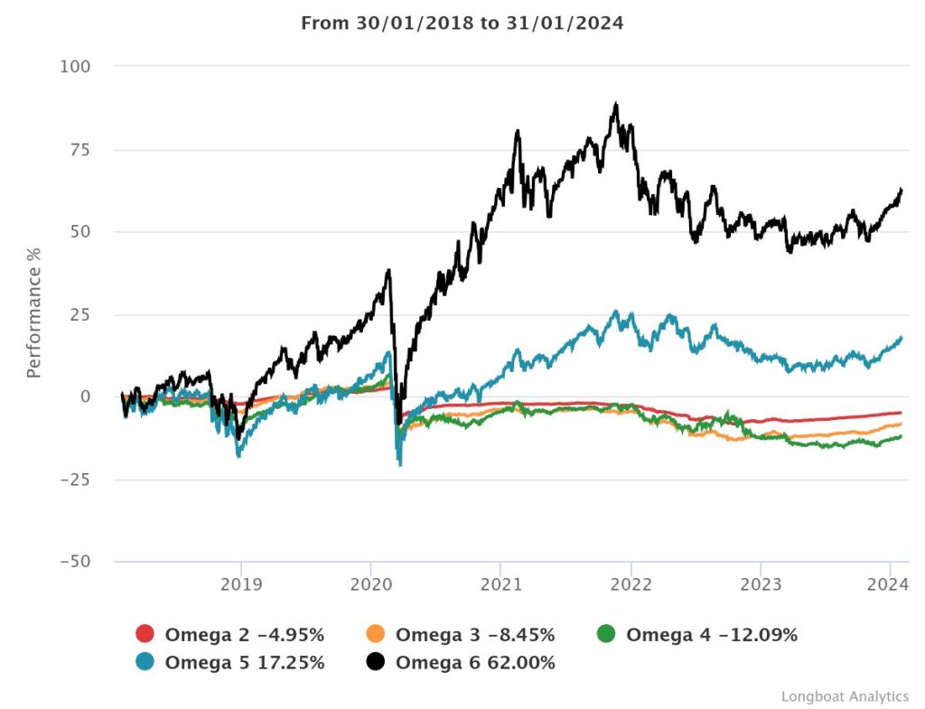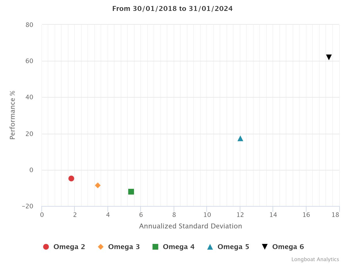 | Omega 4 | -12.09% | -2.12% | 5.4173 | -20.6263% | 0.9317 |