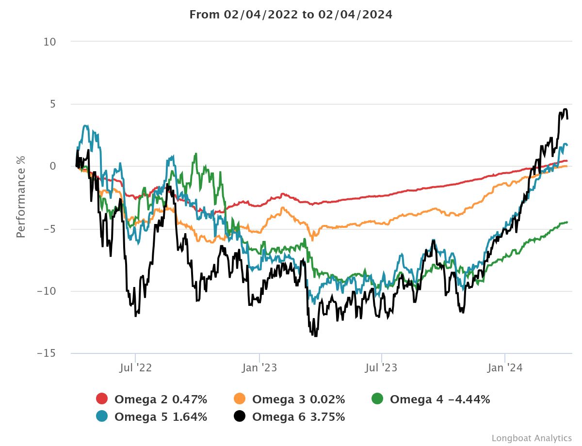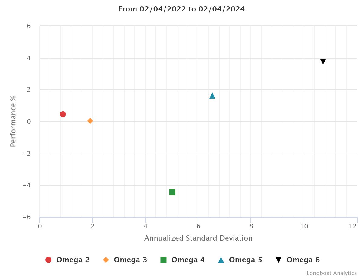 | Omega 4 | -4.44% | -2.25% | 5.0162 | -10.7657% | 0.9215 |