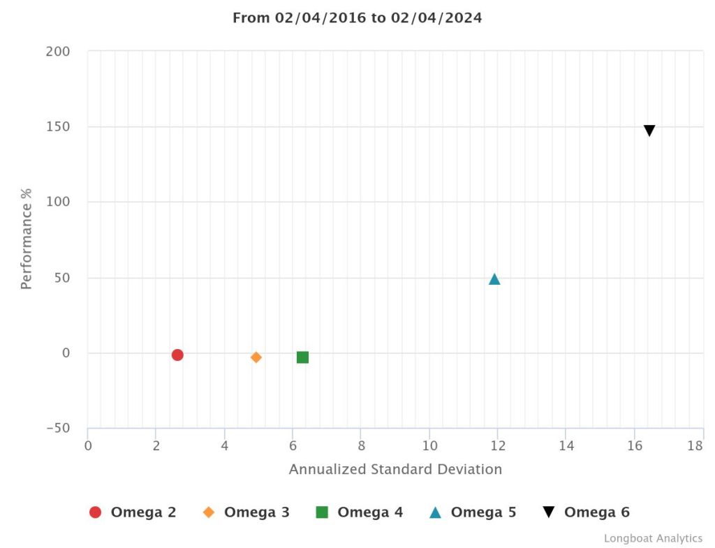 | Omega 5 | 48.67% | 5.08% | 11.9337 | -27.2792% | 1.2157 |