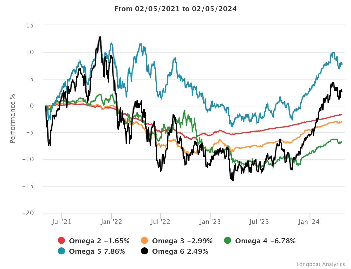 | Omega 3 | -3.01% | -1.01% | 1.8925 | -9.8868% | 0.8999 |