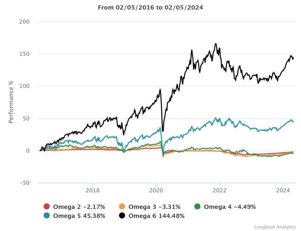 | Omega 6 | 143.23% | 11.75% | 17.3199 | -33.4504% | 1.3309 |