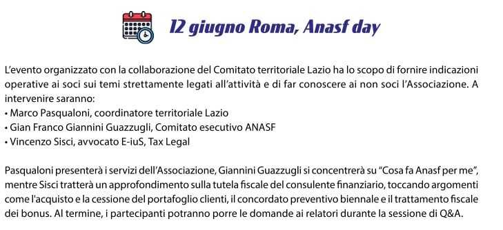 Anasf Day – Roma 12 giugno 2024 L’evento è aperto anche ai consulenti finanziari non soci Anasf. Registrati su https://anasf.it/eventi/10594 Condividi: Fai clic per inviare un link a un amico via e-mail (Si apre in una nuova finestra) E-mail Fai clic qui per stampare (Si apre in una nuova finestra) Stampa Fai clic per condividere su Facebook (Si apre in una nuova finestra) Facebook Fai clic qui per condividere su LinkedIn (Si apre in una nuova finestra) LinkedIn Fai clic per condividere su WhatsApp (Si apre in una nuova finestra) WhatsApp Fai clic per condividere su X (Si apre in una nuova finestra) X Mi piace Caricamento... Correlati