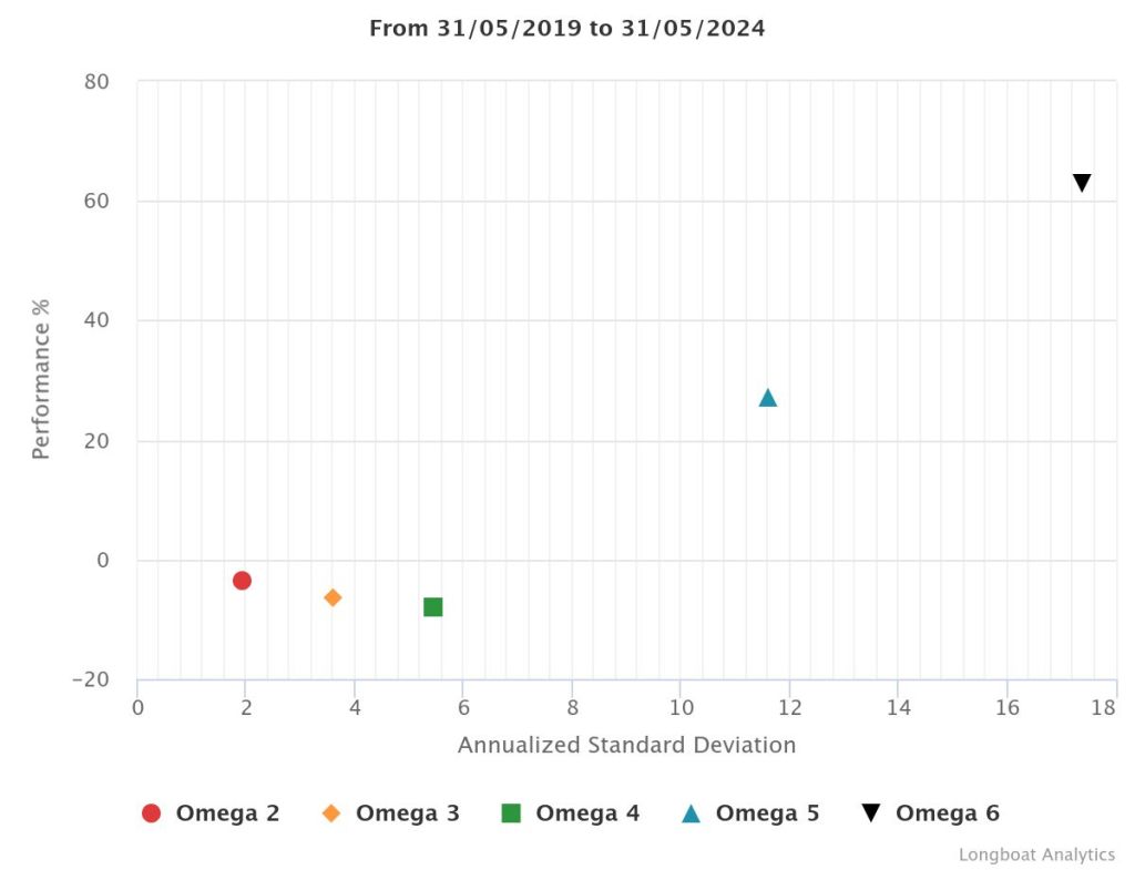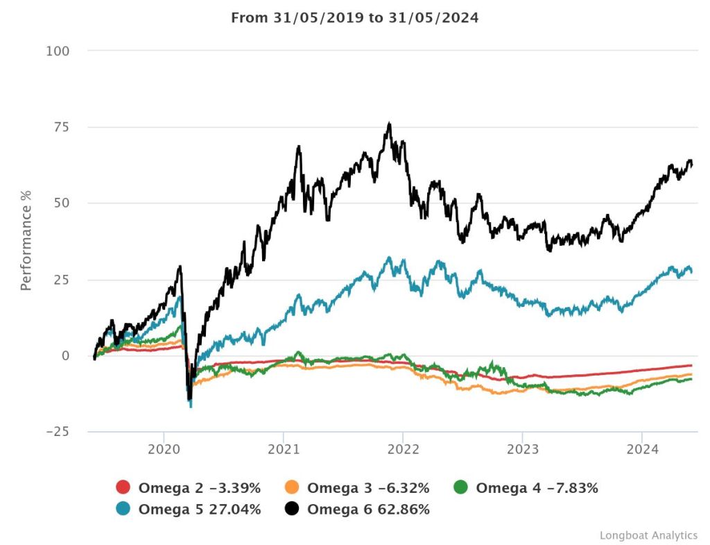 | Omega 5 | 27.04% | 4.90% | 11.6078 | -30.7982% | 1.1047 |