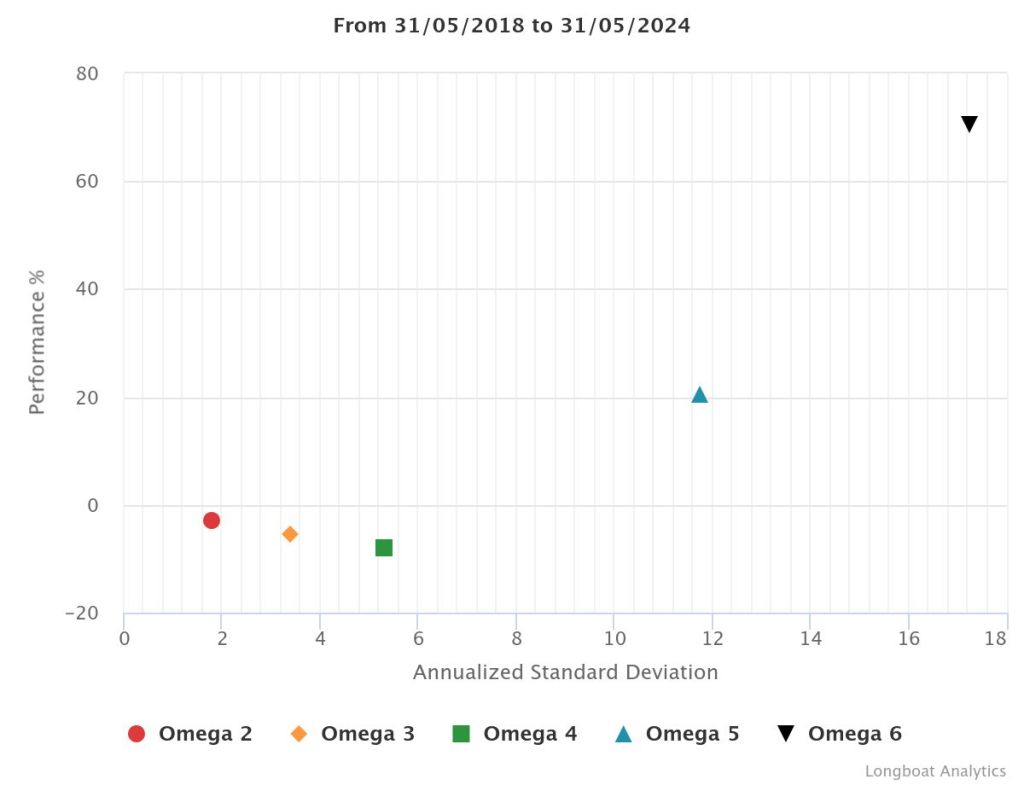 | Omega 5 | 20.51% | 3.16% | 11.7444 | -30.7982% | 1.0683 |