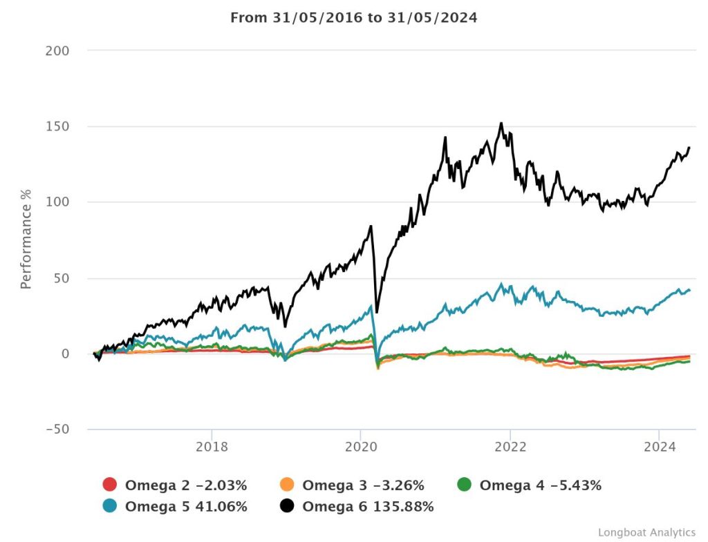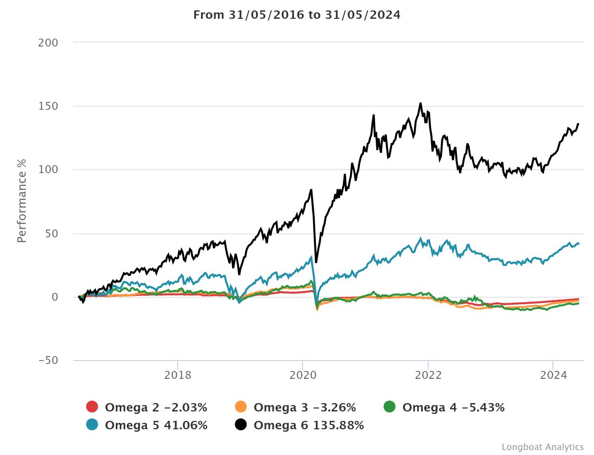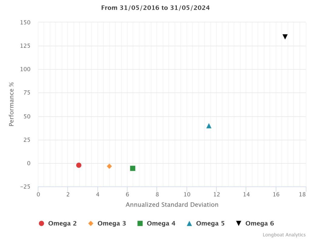 | Omega 6 | 134.40% | 11.24% | 16.6066 | -31.5069% | 1.3153 |