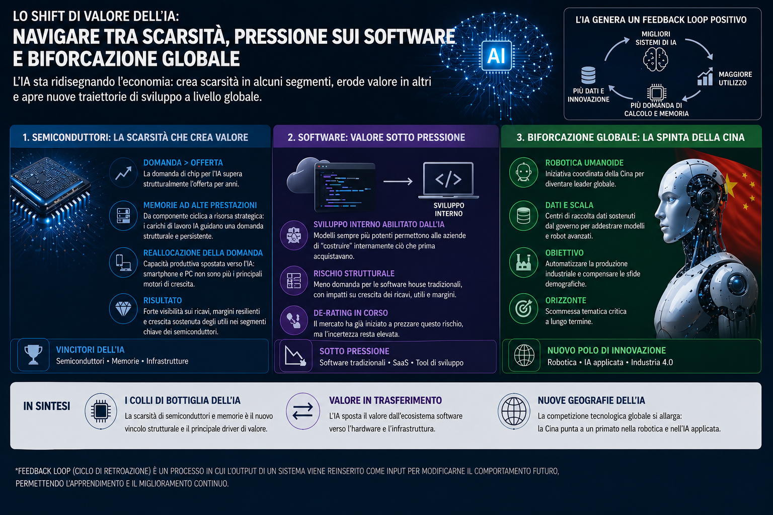 - L’ecosistema dei semiconduttori, in particolare le memorie ad alte prestazioni, rimane l’area più interessante per i capitali, poiché i colli di bottiglia strutturali nell’offerta e il feedback loop* dell’IA sostengono un’elevata visibilità dei ricavi e la