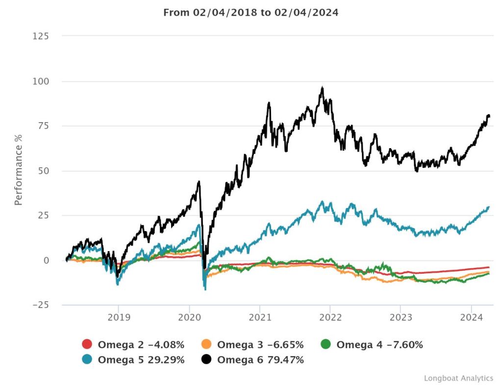 | Omega 5 | 48.67% | 5.08% | 11.9337 | -27.2792% | 1.2157 |