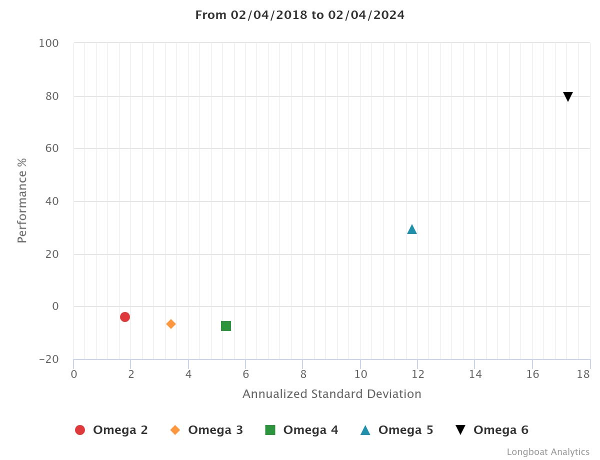 | Omega 5 | 48.67% | 5.08% | 11.9337 | -27.2792% | 1.2157 |