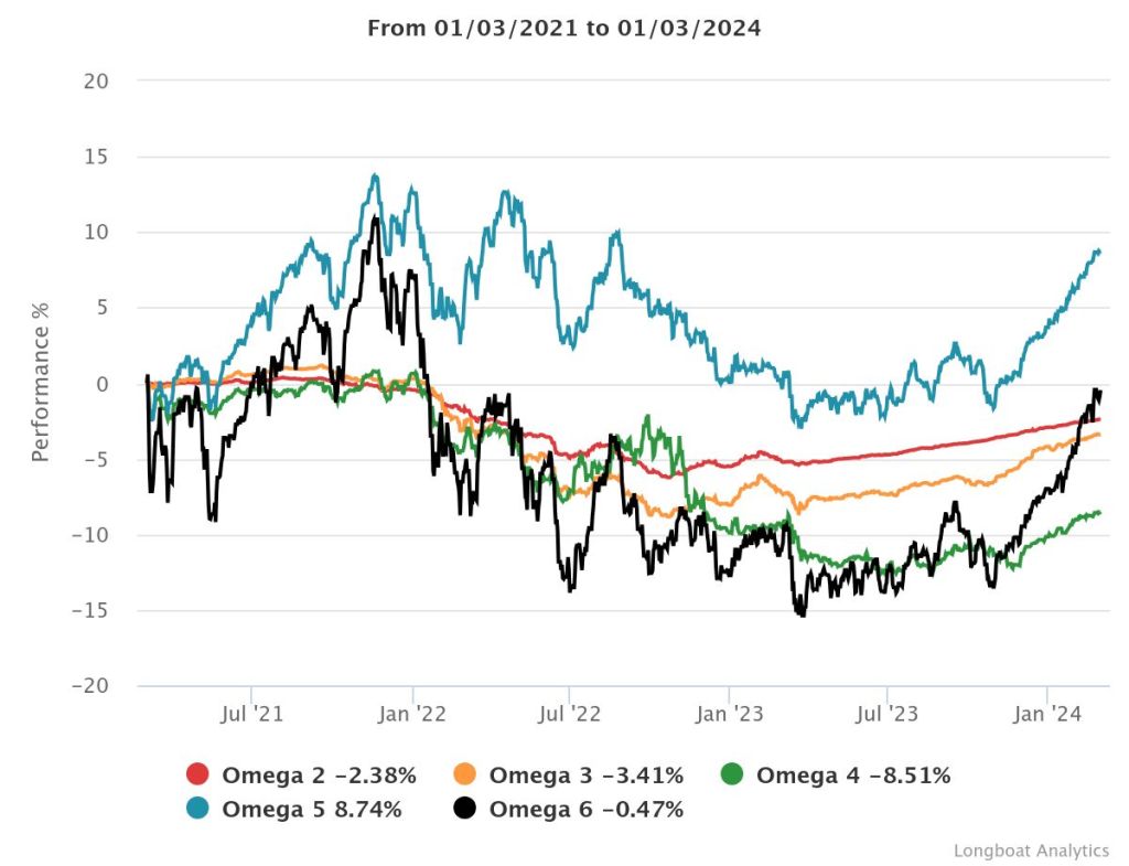 | Omega 3 | -3.41% | -1.15% | 1.9017 | -9.8868% | 0.8880 |