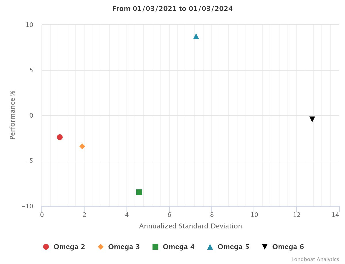 | Omega 4 | -8.51% | -2.92% | 4.5879 | -13.3142% | 0.8889 |