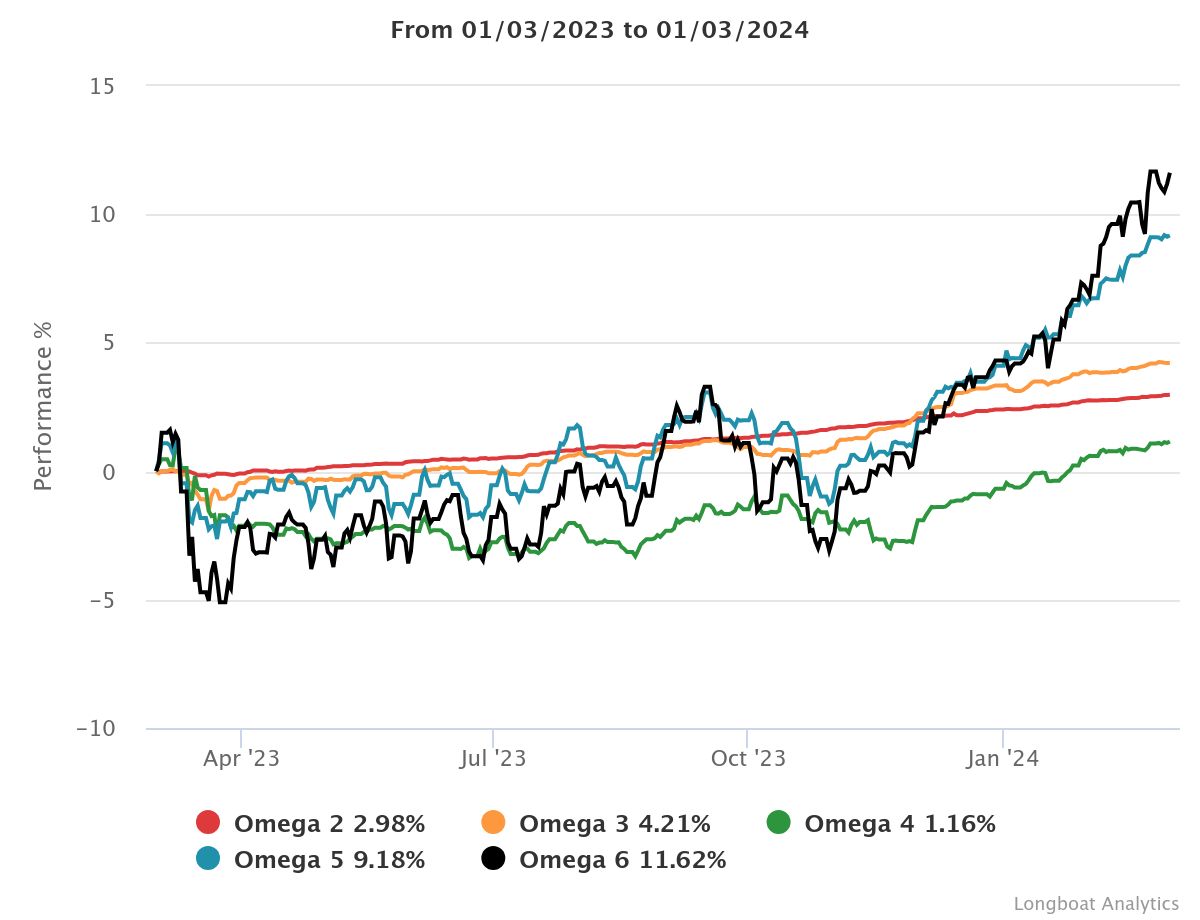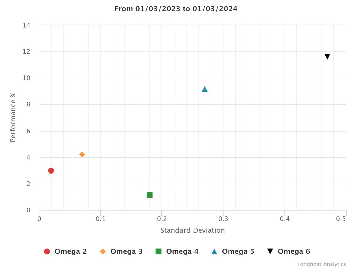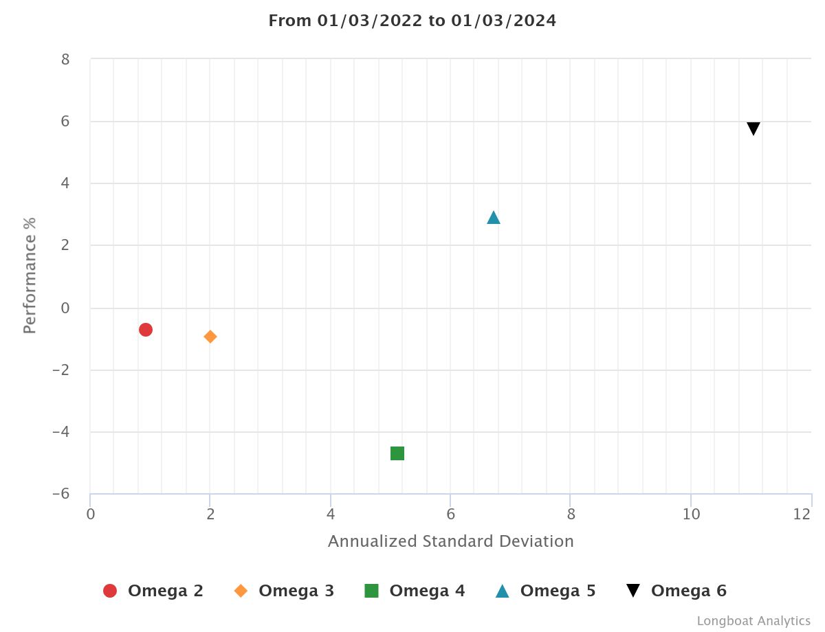 | Omega 5 | 8.74% | 2.83% | 7.2633 | -14.7126% | 1.0724 |