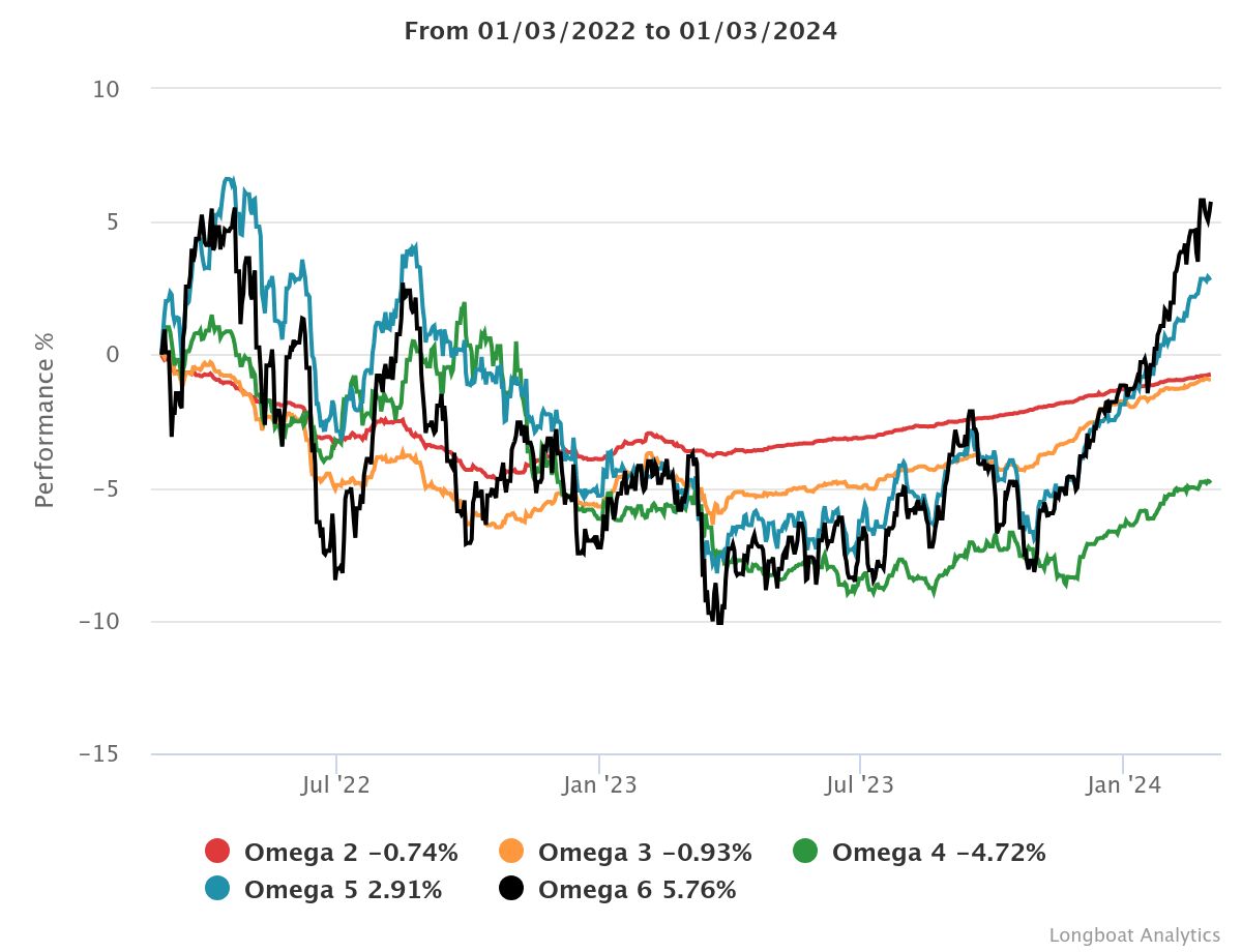 | Omega 2 | -2.38% | -0.80% | 0.8425 | -6.5991% | 0.8336 |