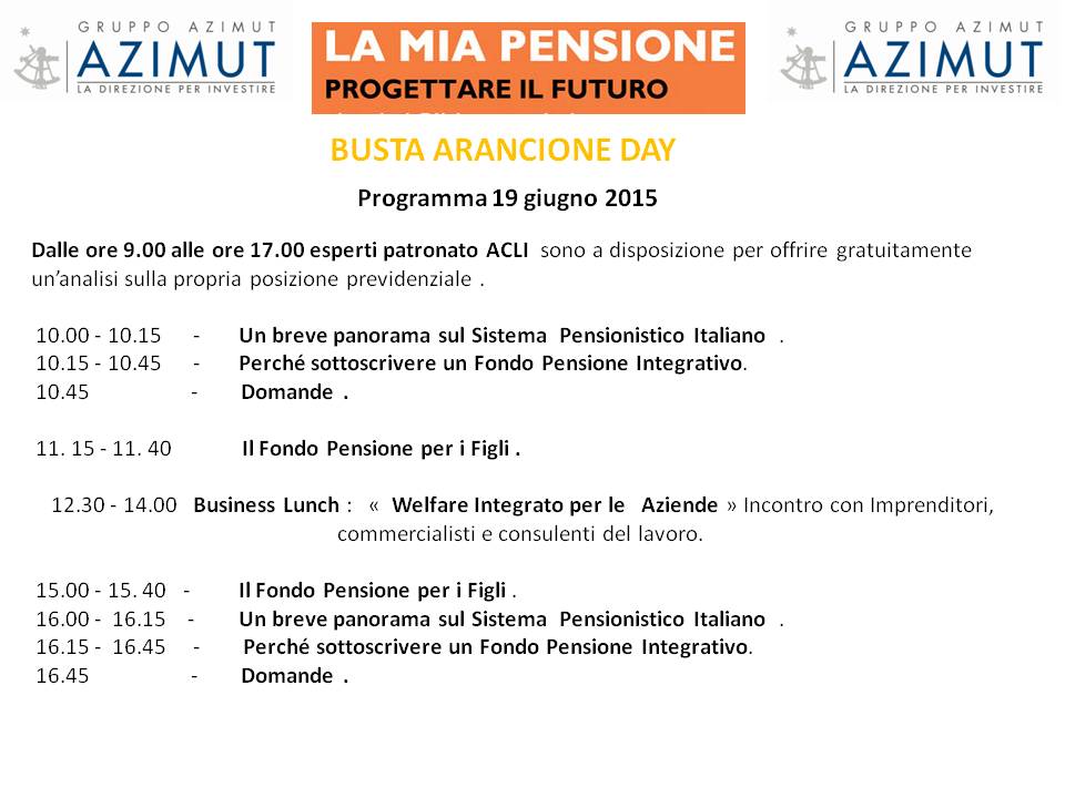 Azimut insieme al Patronato Acli ha organizzato  l’iniziativa   Busta Arancione Day  Venerdì 19 giugno 2015  a partire dalle ore 9.00 .