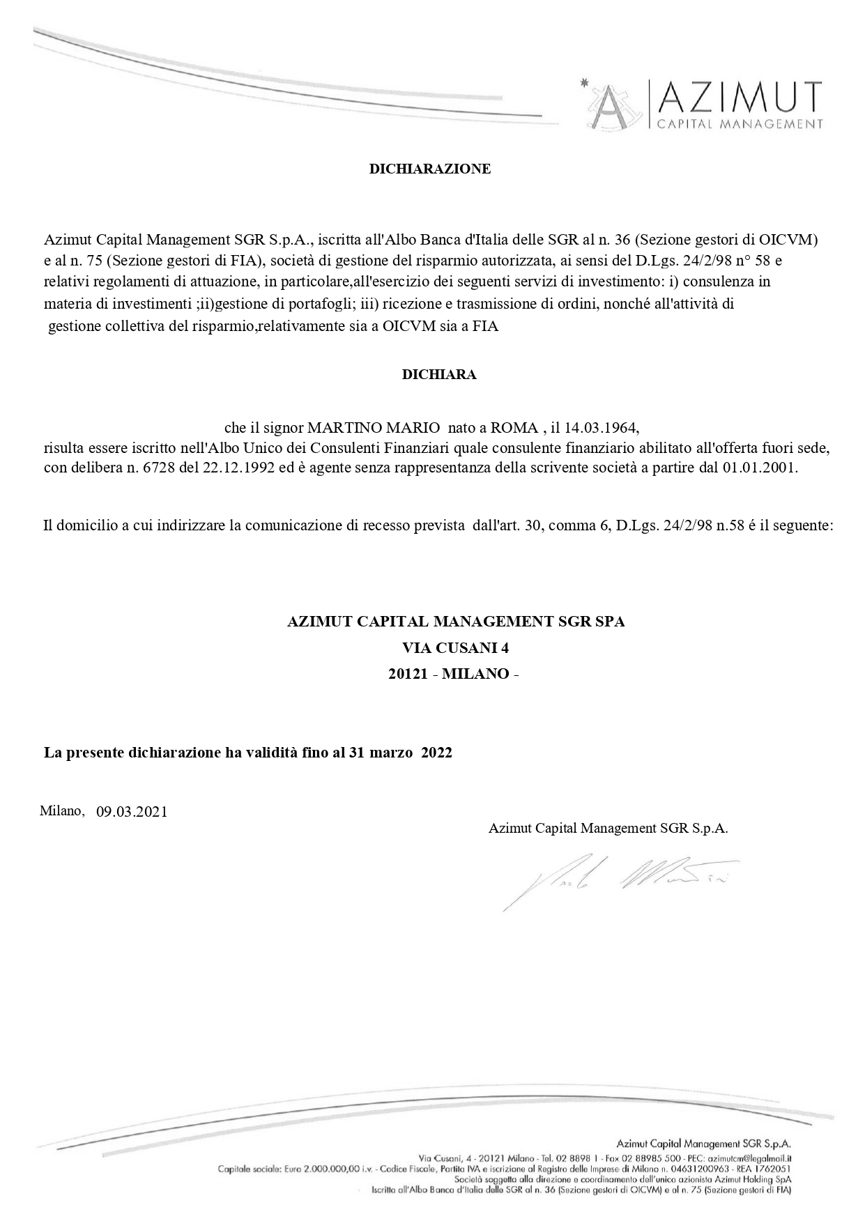 Dal 1° ottobre 2016 Azimut Consulenza Sim è stata incorporata in Azimut Capital Management Sgr.